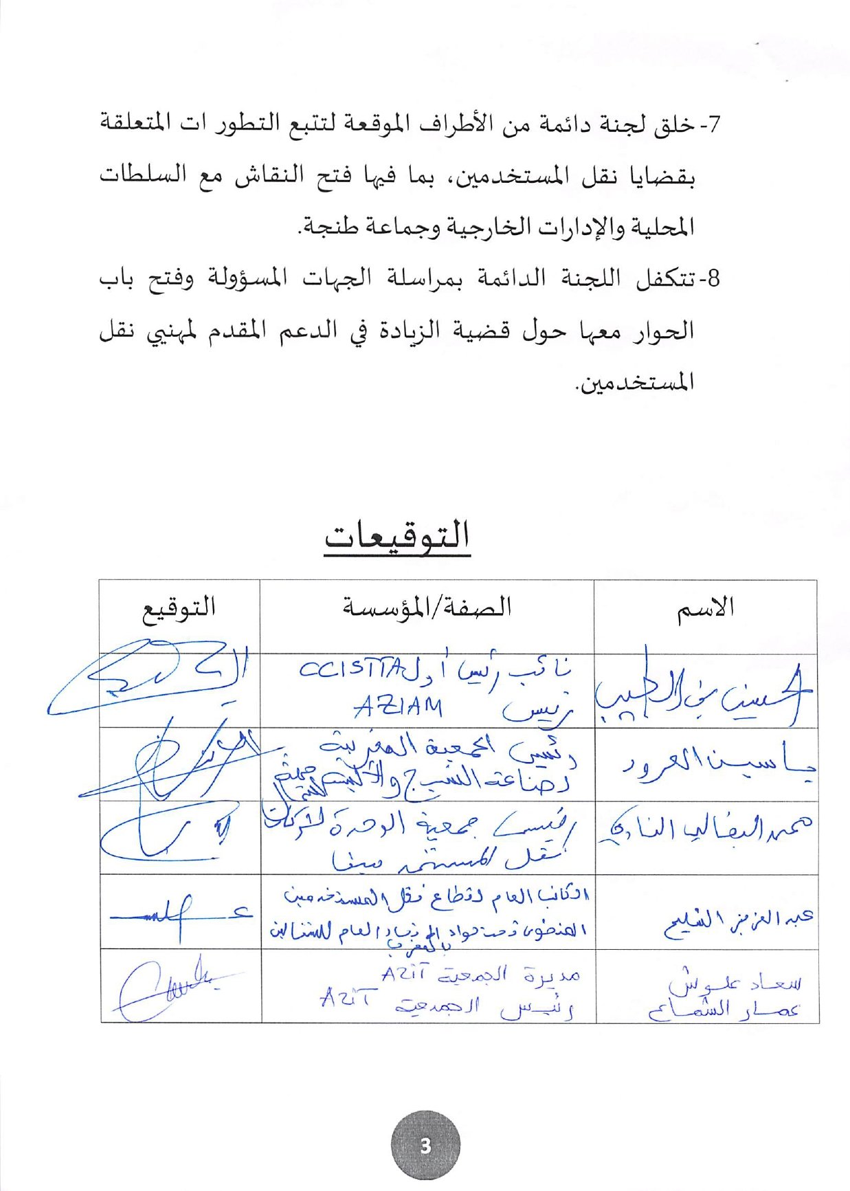 7- خلق لجنة دائمة من الأطراف الموقعة، لتتبع التطورات المتعلقة بقضايا نقل المستخدمين، وفتح النقاش مع السلطات المحلية والإدارات الخارجية وجماعة طنجة.