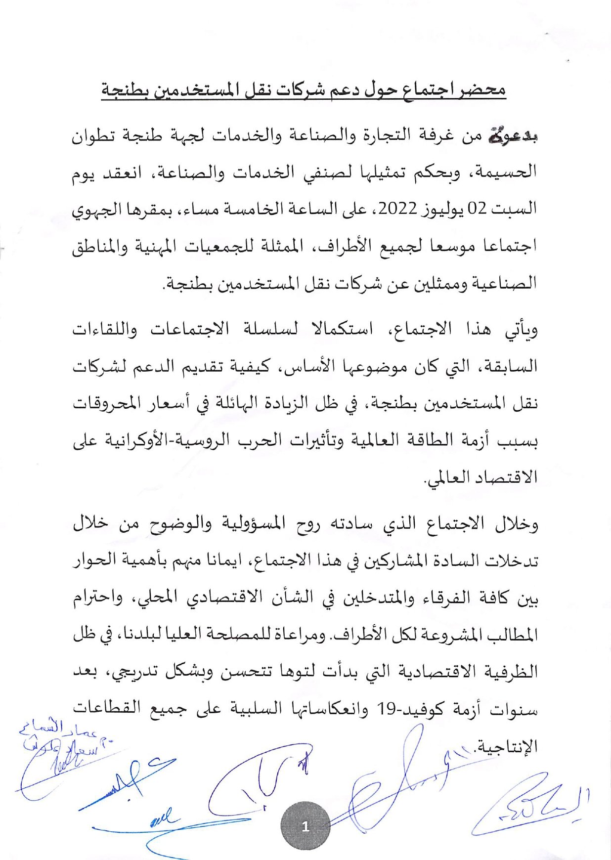 بعد سلسلة من اللقاءات التي جمعت بين العديد من ممثلي الجمعيات المهنية والمناطق الصناعية وممثلين عن مهنيي نقل المستخدمين، التي احتضنتها غرفة التجارة والصناعة والخدمات لجهة طنجة تطوان الحسيمة وأشرفت عليها. والتي كانت بخصوص مسألة الدعم المقدم لشركات نقل المستخدمين. وبعد الزيادات المتتالية في أسعار المحروقات، والتي أعلنت على إثرها مجموعة من شركات نقل المستخدمين التوقف عن العمل بداية من ليلة الاحد صبيحة 04 يوليوز 2022.