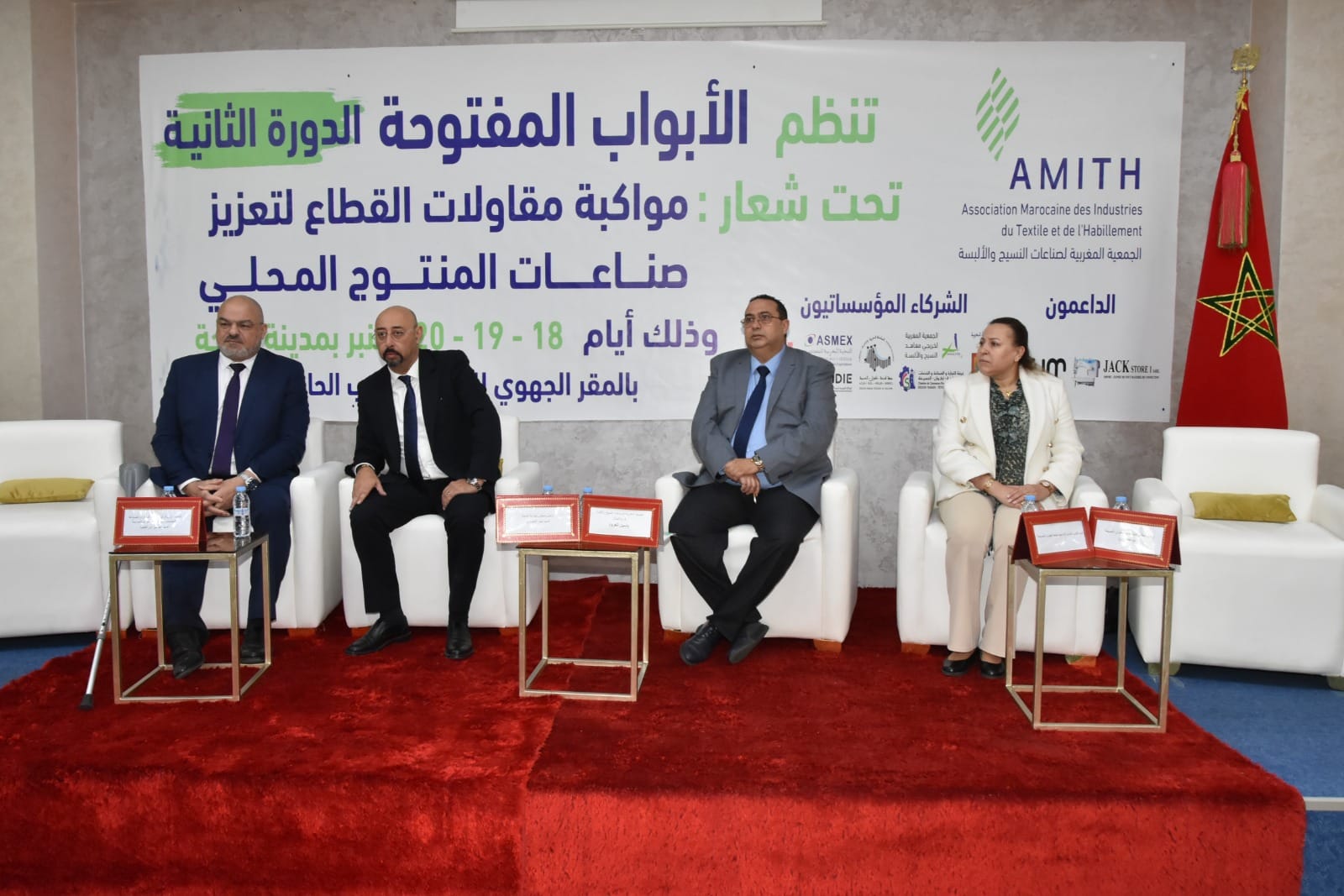 و قد عرفت الجلسة الافتتاحية مشاركة كل من السيد ياسين العرود رئيس الجمعية المغربية لصناعات النسيج و الألبسة -فرع الشمال- و السيد منير الليموري عمدة مدينة طنجة و السيدة الشعيبية بلبزيوي العلوي رئيسة جمعية النساء المقاولات بالمغرب -فرع الشمال- بحضور مكثف من مديري المصالح الخارجية و المؤسسات العمومية و الجمعيات المهنية و ارباب شركات النسيج و الألبسة بالجهة.